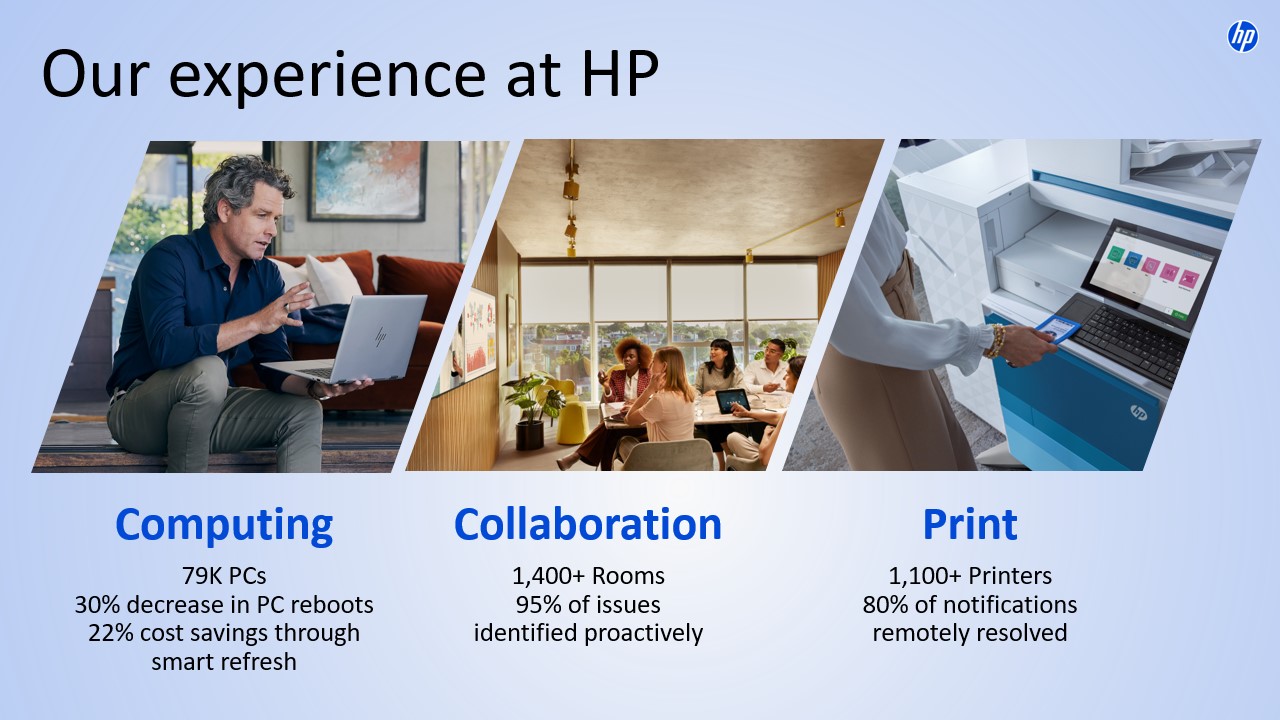 The impact is massive. When HP deployed WXP internally, our organization saw a 30% reduction in reboots, a 22% reduction in refresh costs driven by AI insights, and an 80% reduction in print issues requiring on-site support. Similarly, The University of Kansas Health System used WXP to improve employee sentiment, reduce refresh costs by more than $1,000 per device, and boost overall device performance across its 18,000-device environment.