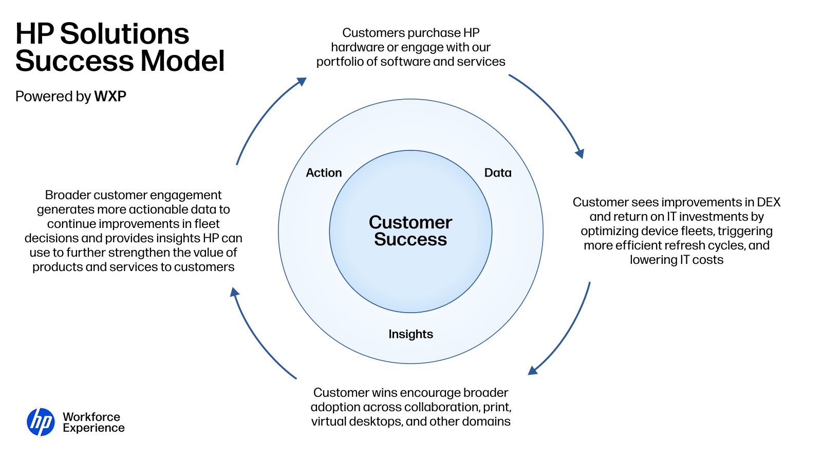 The HP Solutions Success Model helps enterprise CIOs and IT leaders manage complex technology environments. It’s powered by the HP Workforce Experience Platform (WXP), which uses device telemetry and AI to turn billions of data points into actionable insights.