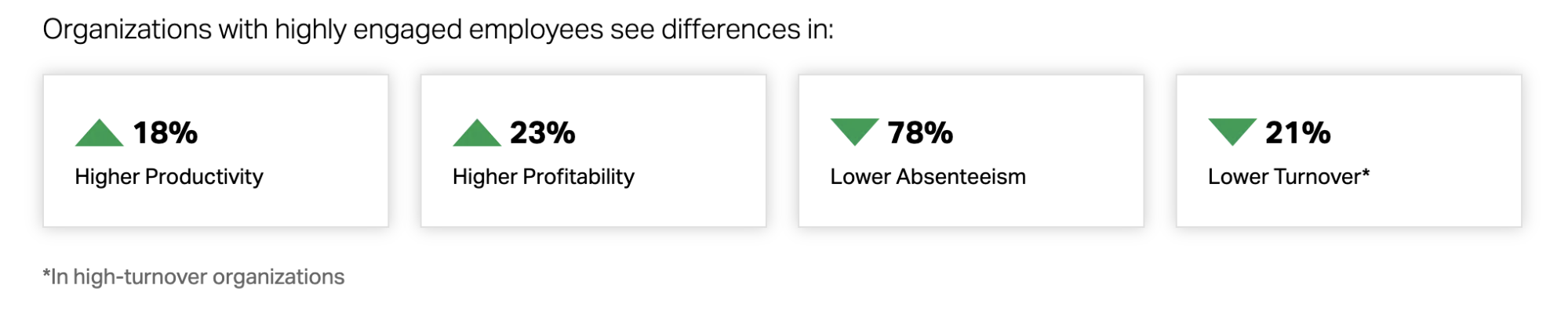 According to Gallup, engaged employees lead to higher profitability, increased productivity, reduced absenteeism, and lower turnover rates.