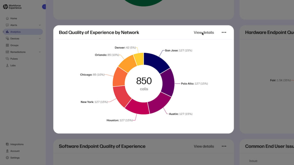 WXP Collaboration measures and monitors the overall employee experience of your collaboration estate, including the performance of communications equipment like video and audio endpoints, networks, and applications. It provides helpful analytics into meeting quality by location for both remote and in-office workers, insights into the performance of corporate networks, and device health trends for both the room systems and individual PCs within a meeting.