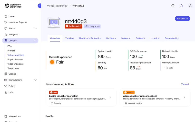 - Recommendations: Identify issues from device data and survey results to share recommended actions.